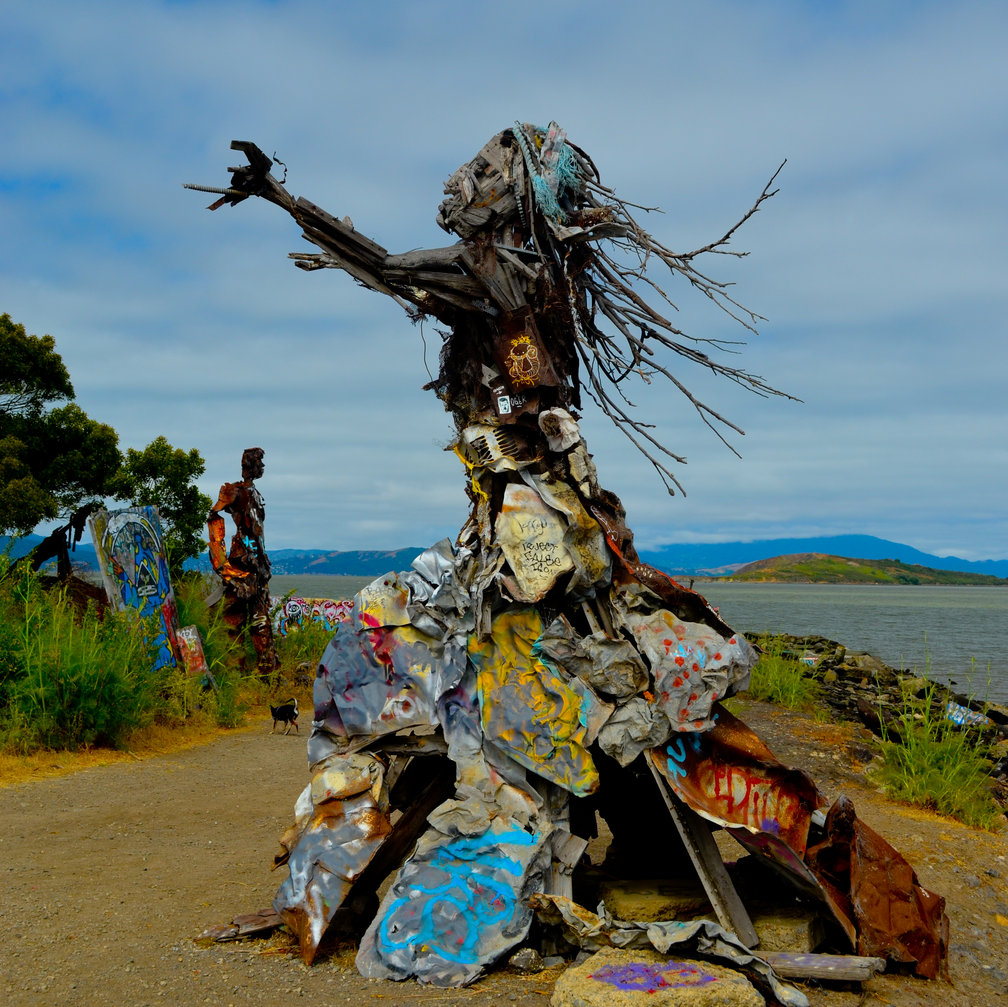 As we approached Daffy’s beak the art began to appear, first as a graffitied tree then as oversized intricate wood, steel and plastic human figures in various poses, some sitting side by side on a fallen tree while pondering their surroundings, others riding dragons or standing among the rocks. As I came to the end of Daffy’s beak, I was particularly moved by what I saw as a Native American woman who could be dancing, in the midst of an animated conversation or mourning a loss. In either case, she moved me. I wanted to understand what she was trying to say. I wanted to know who created her so I could ask. Her image was both haunting and beautiful. We moved on along the shoreline climbing over discarded blocks of loose concrete and a mine field of rebar twisting and protruding every which way. I wondered out loud when I had my last tetanus shot.