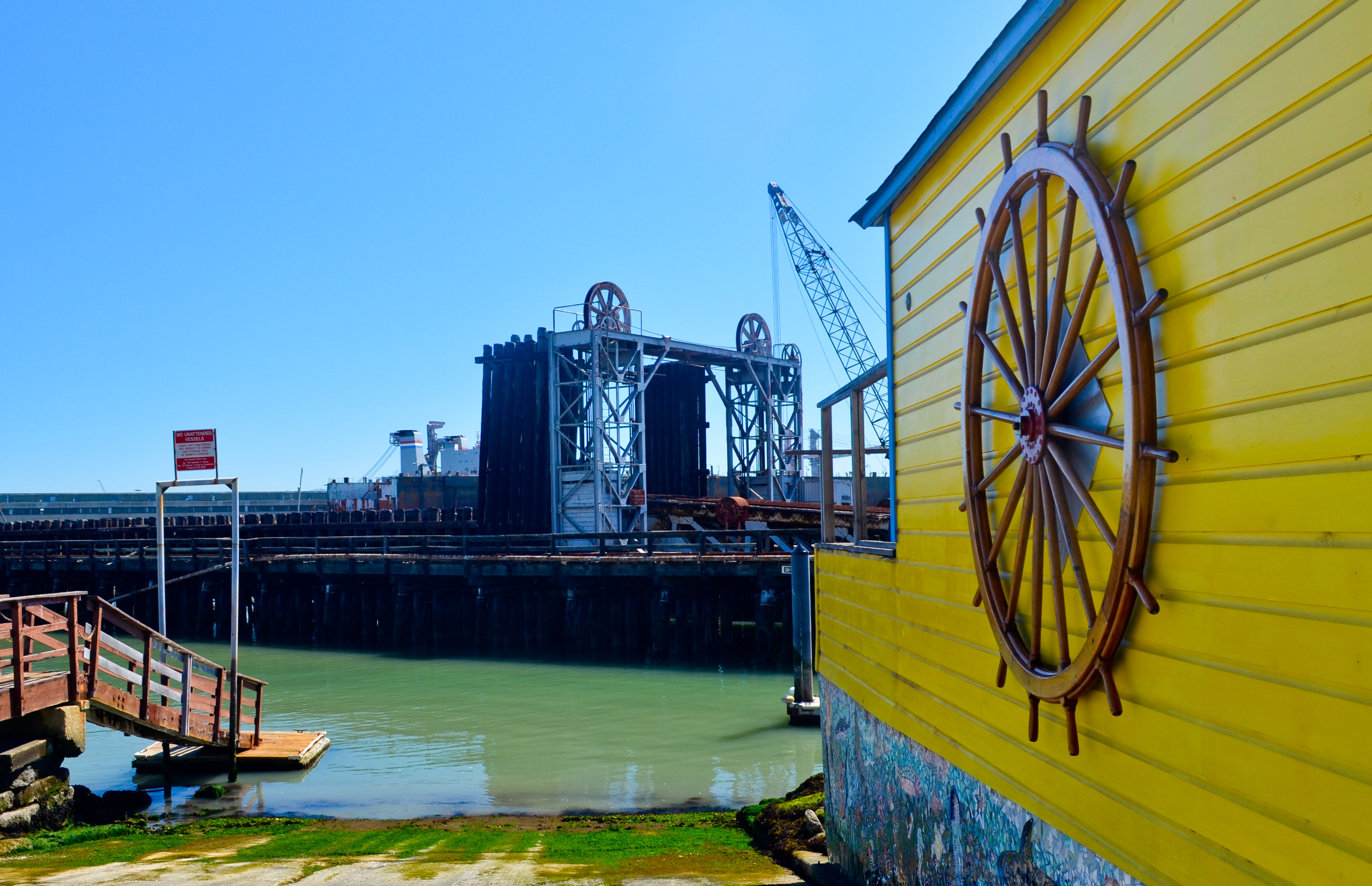 So what captured my attention during those last three miles of my Bay Trail odyssey besides the celebration? Like the Bay Trail, this short three mile section which includes Mission Bay, the Central Waterfront and the Embarcadero, celebrates new beginnings while embracing the old. UCSF unravels medical mysteries in their new headquarters in Mission Bay. Glass and granite low-rise condominium buildings shine in the sun and enjoy our City’s best weather and bay views. And a bit of old school San Francisco, the Bay View Boat Club, stands vigilant over the water’s edge along Terry Francois Boulevard. With its bright yellow paint, old wooden ships wheel and navy blue trim, this living piece of waterfront history caught my attention. It originated in its namesake neighborhood in 1961, however in 1964 the original site was sold. A work party was formed and the structure was guided down a hill on rollers, placed on a barge and towed to where it now stands at 489 Terry Francois Boulevard. The following is from the Bay View Boat Club’s website (as are the preceding historical facts):