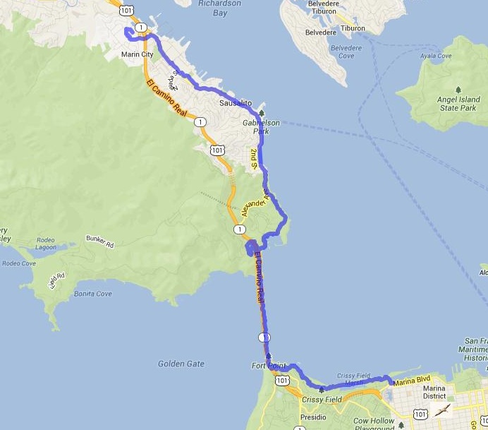 Distance: 13.4 miles (21.6km) (Starting at Marin City Bus depot)
