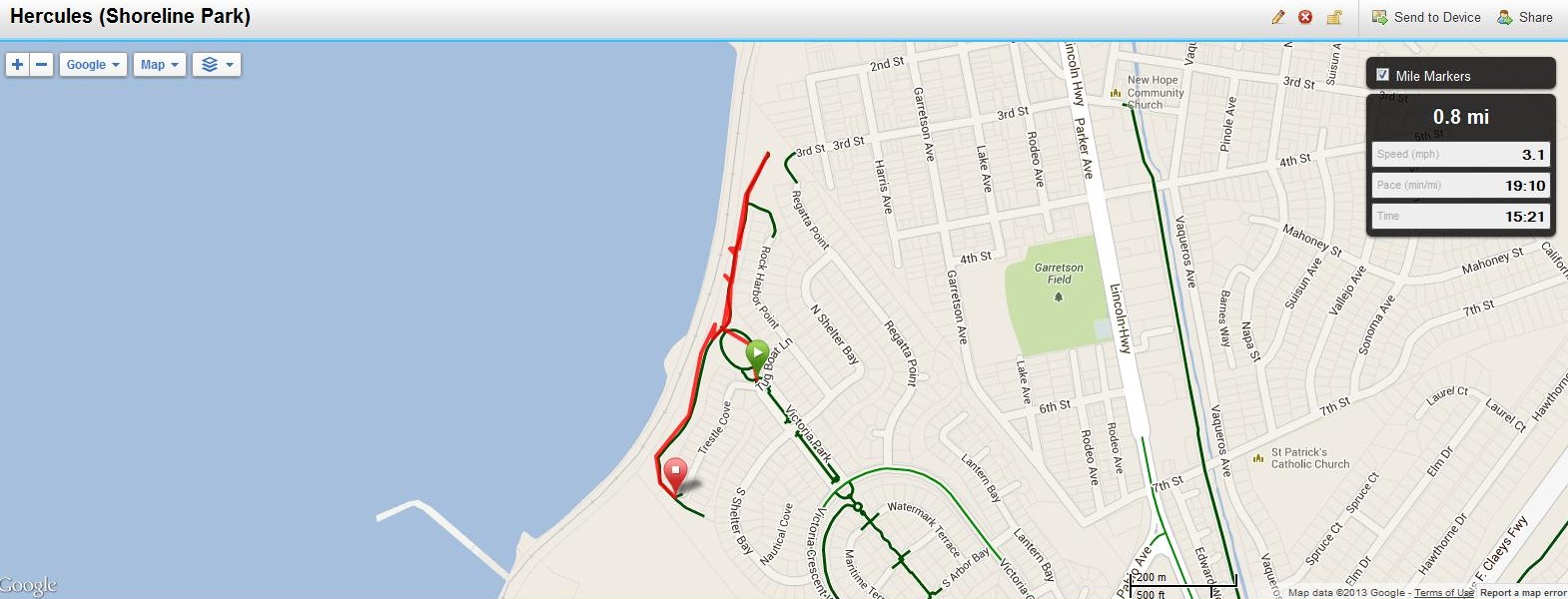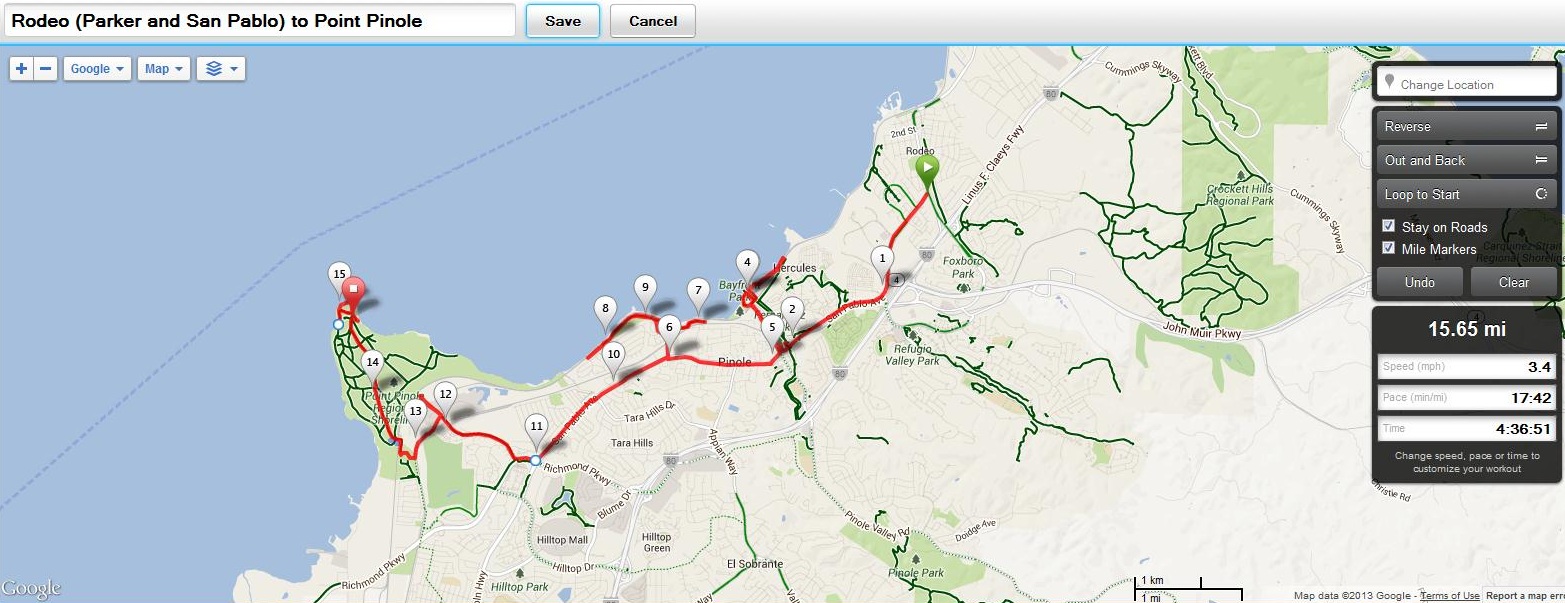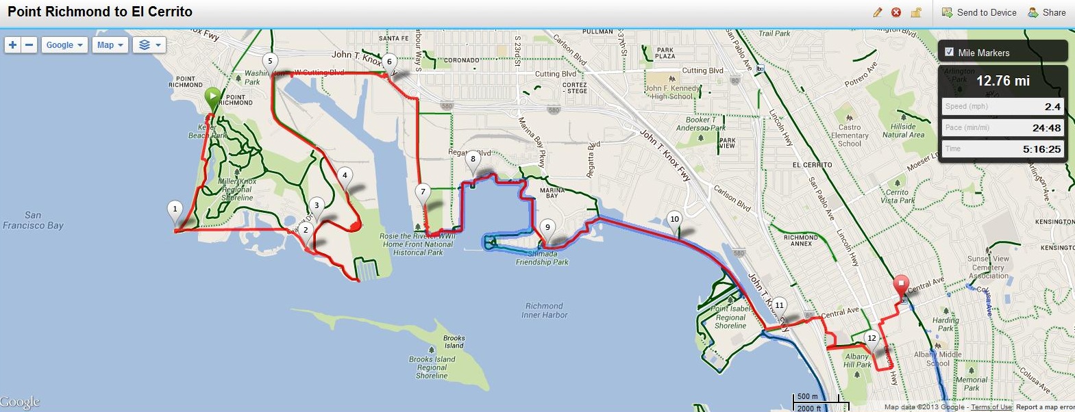 Distance: 14.46 miles (23.27km) from El Cerrito BART and includes Pt. Isabel loop