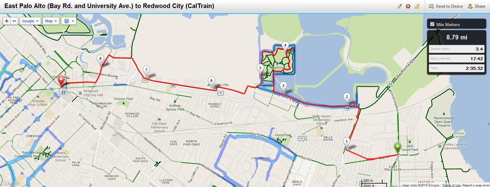Transportation to start: San Francisco CalTrain to Palo Alto Station, Transfer to SamTrans 281, Offboard at Bay Rd. and University. Walk east on University to Highway 84 for most direct route to BayTrail. (NOTE: I took a slightly different route, see map)