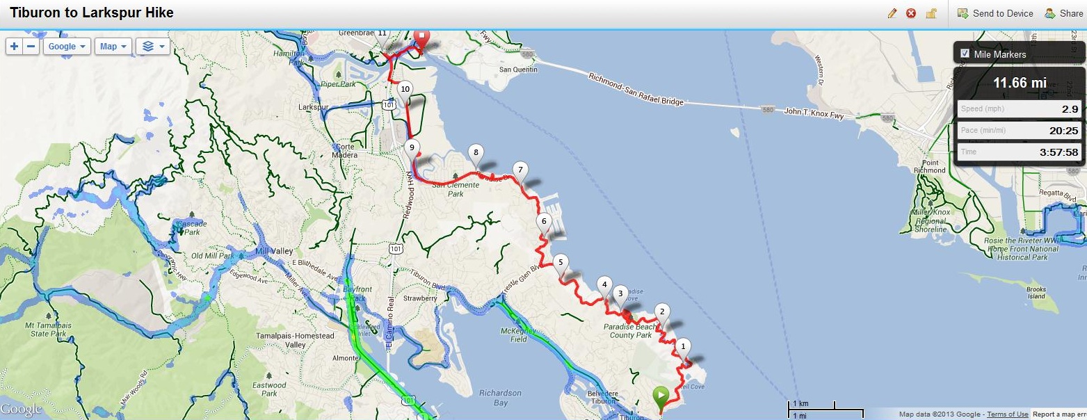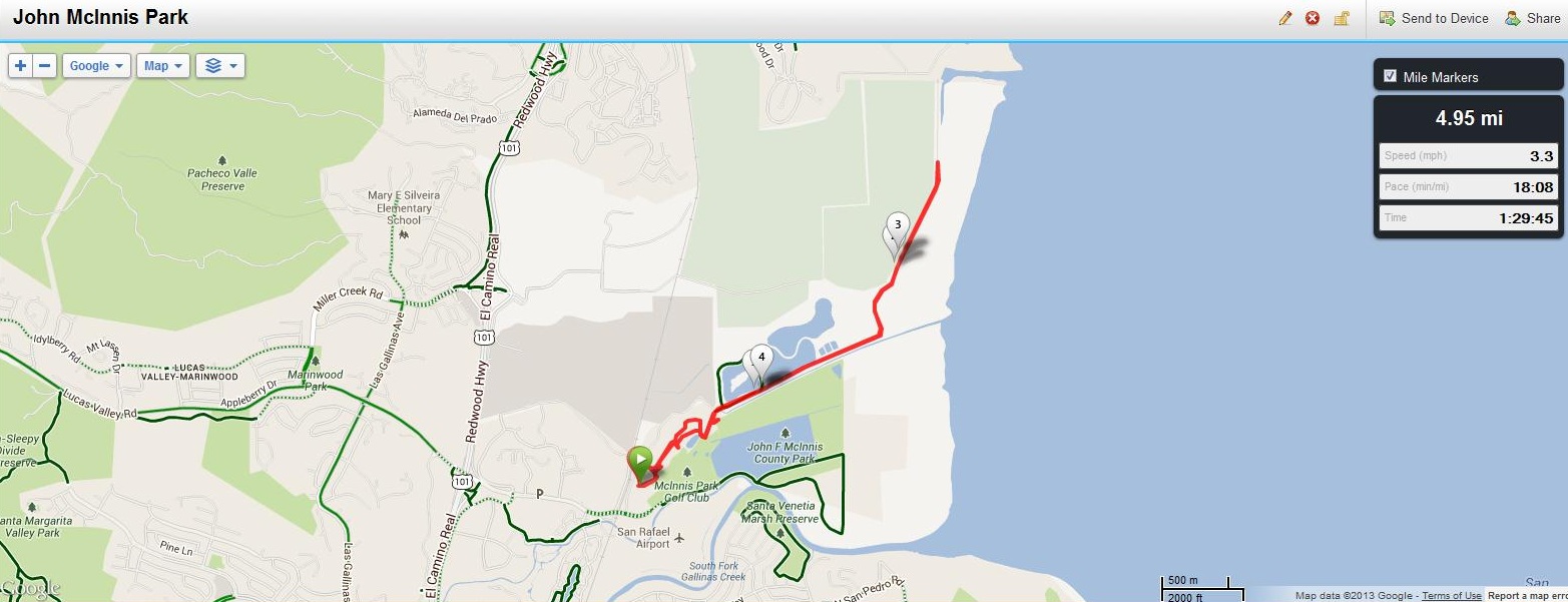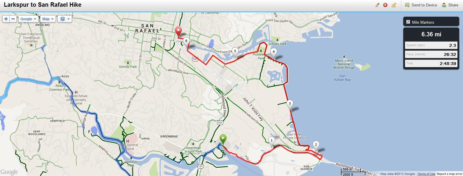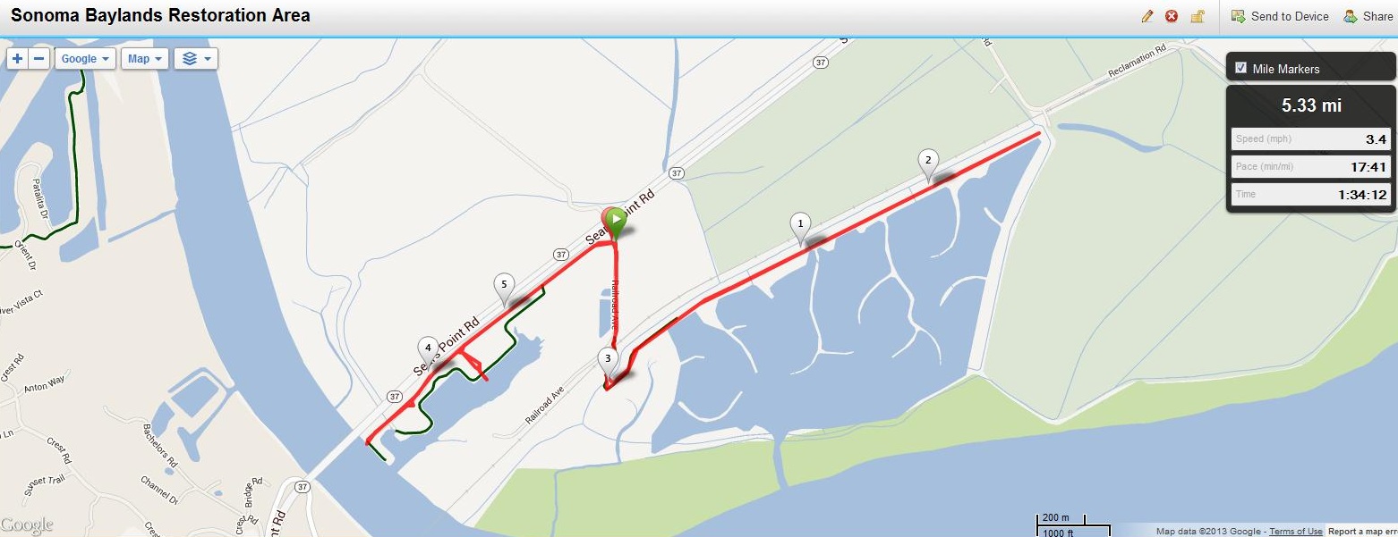 NOTE: I highly recommend turning left after the first mile onto Anderson Drive then right onto Bellam to get to the San Rafael Bay shoreline, rather than taking the freeway on-ramp shoulder as I did and is shown on this map. The shoulder is not safe and cars travel at very high rates of speed here. Also, from Pickleweed Park I did not follow the existing Bay Trail but rather tested a proposed trail. From Pickleweed Park, I recommend heading south on Kerner for about a half mile then right onto Bellam, go under the freeway and turn right onto the Bay Trail which follows Anderson.